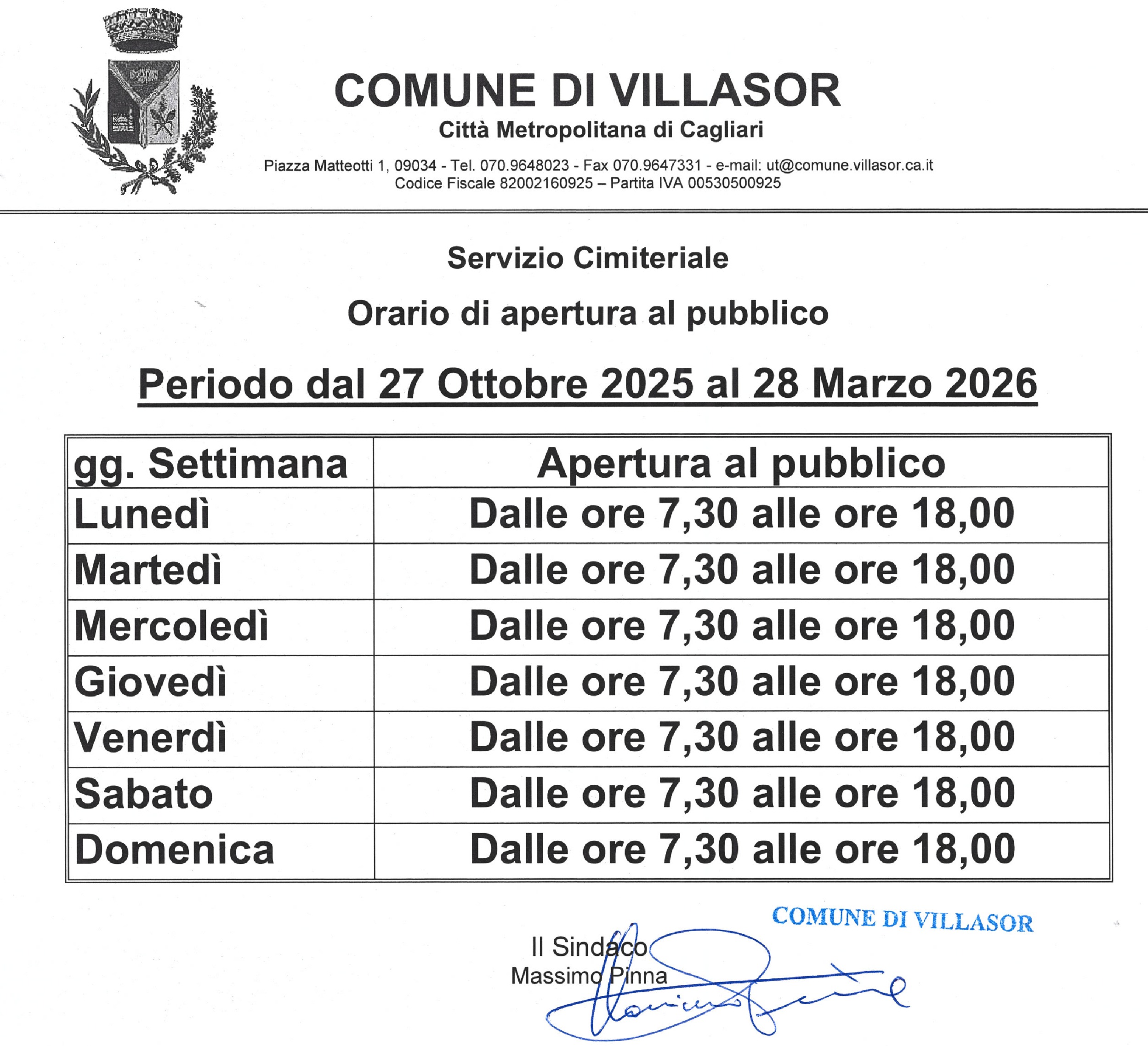 Si comunica che, a partire dal 27 ottobre 2025 e sino al 28 marzo 2026, il cimitero avrà i seguenti orari di apertura al pubblico: