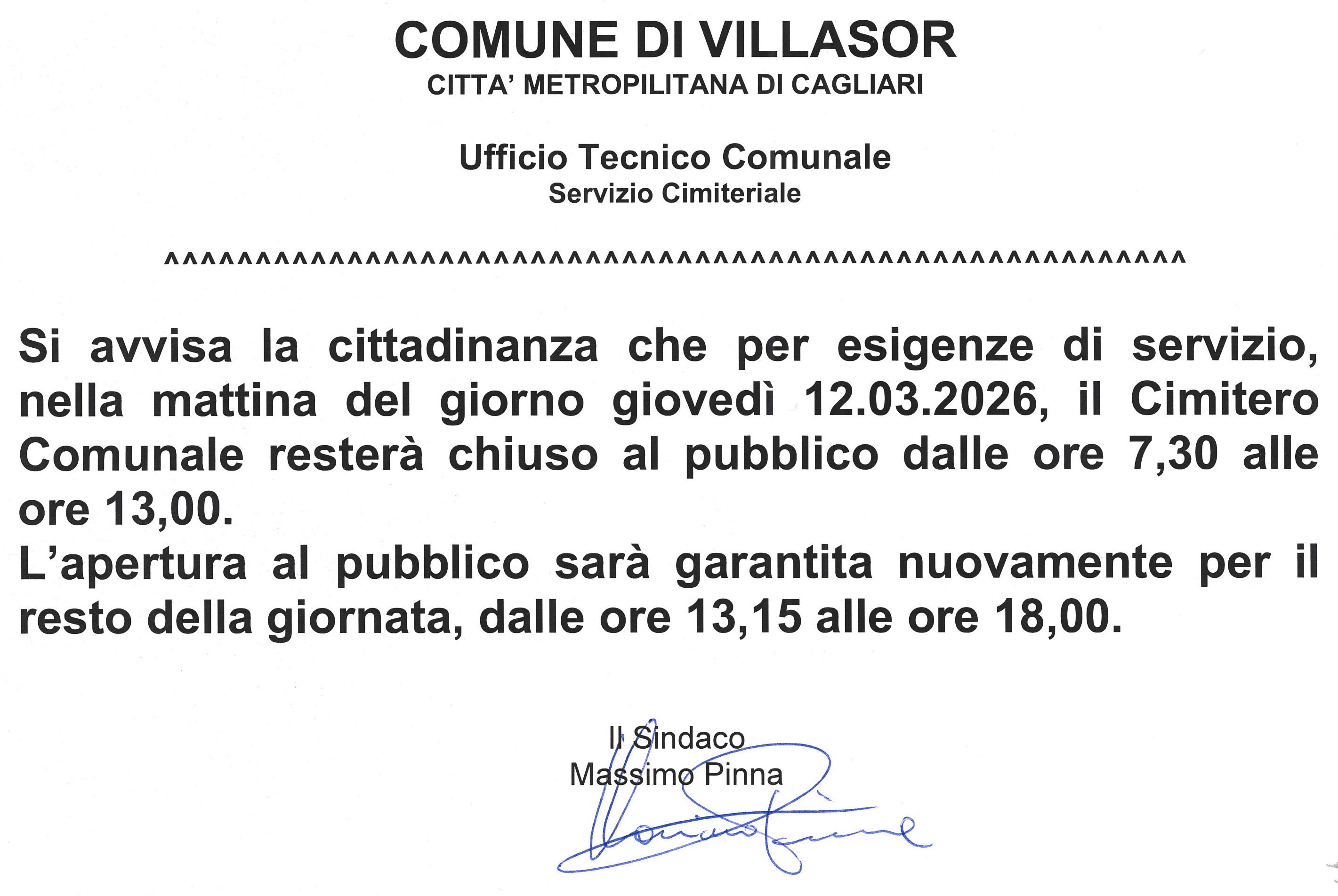 Si avvisa la cittadinanza che, per esigenze di servizio, nella mattina di giovedì 12 marzo 2026, il cimitero comunale resterà chiuso al pubblico dalle ore 7.30 alle ore 13.00.